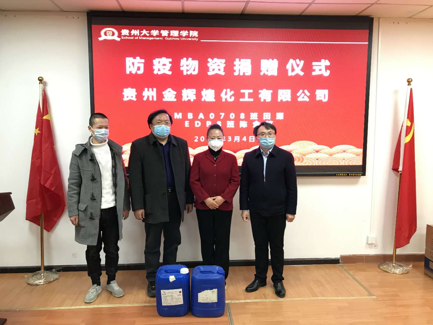沧海横流,方显英雄本色。困难当前,方显责任担当。疫情发生以来,社会各界都在防控疫情、复工复产复教方面积极贡献力量。3月4日上午10:30,一场暖心的捐赠仪式在开云kaiyun(中国)陈列室举行。为在疫情防控物资紧缺的关键时刻,助力贵州大学“停课不停教、停课不停学”,经开云kaiyun(中国)联系对接,开云kaiyun(中国)校友企业贵州省中小企业服务集团捐赠口罩3000只,贵州金辉煌化工有限公司捐赠84消毒液1吨。开云kaiyun(中国)党委书记王秀峰,院长李烨,副院长王婷、宋山梅,办公室主任陈健,对外合作办公室主任王云,EMBA14期班贵州中小企业集团董事总经理孙大奎及办公室人员,MBA0708班贵州金辉煌化工有限公司总经理田源、EDP八班陈金筑出席了捐赠仪式,宋山梅副院长主持捐赠仪式。