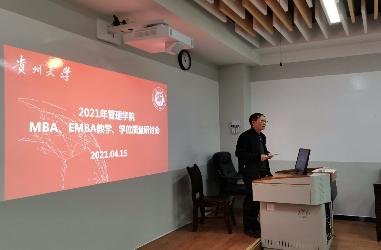 2021年4月15日上午,开云kaiyun(中国)MBA教育中心在202教室举行“2021年管理学院MBA、EMBA教学及学位质量研讨会”。贵州大学研究生院院长杜滨教授、管理学院副院长周莉莉教授、30余位MBA中心任课老师及研究生导师、MBA中心主任项凯标教授、EMBA中心主任李雨峰老师、MBA中心副主任何跃勇老师、MBA中心办公室主任邓琳老师以及中心工作人员共40余位人参加了此次研讨会。研讨会由副院长周莉莉教授主持。