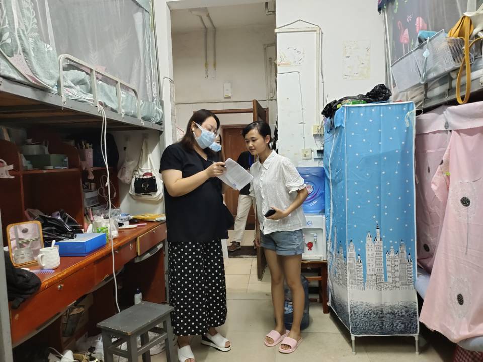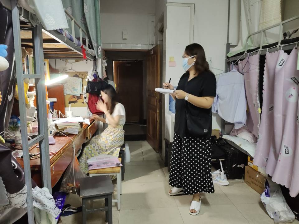 疫情特殊时期,三位老师在走访过程中关切地询问了学生返校情况,确认有无从中高风险地区返校的同学外宿情况,同时检查了寝室设施的完整情况,并嘱托同学们在宿舍设施出现故障和损坏时要及时报修。