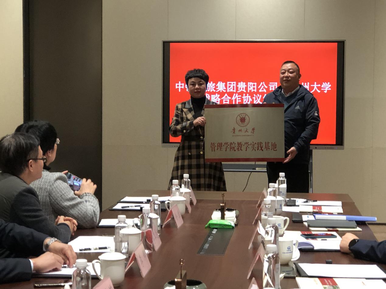 管理学院院长李烨、学院党委副书记周莉莉(主持党委工作)、副院长李本光、党委副书记邓琳、党政办主任徐兰、工商管理系主任兼系支部书记许为宾、市场营销系系主任刘遗志、对外合作办主任刘梅、贵州装饰设计行业协会会长&管理学院校友会秘书长陆春宝、贵阳市新兴青年发展促进会会长&管理理学院校友会副秘书长刘勇军,中铁文旅集团贵阳公司总经理胡永清、纪委书记罗兴科、副总经理梁济光、副总经理袁天国等出席签约暨揭牌仪式。管理学院院长李烨、中铁文旅集团贵阳公司总经理胡永清代表双方签署校企战略合作协议。贵州大学党委正处级组织员、管理学院党委副书记周莉莉、中铁文旅集团贵阳公司纪委书记罗兴科共同为管理学院教学实践基地揭牌。